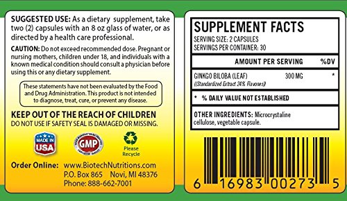 Product DescriptionBiotech Nutrition's Ginkgo Biloba 300mg Per Serving 60 Capsules0