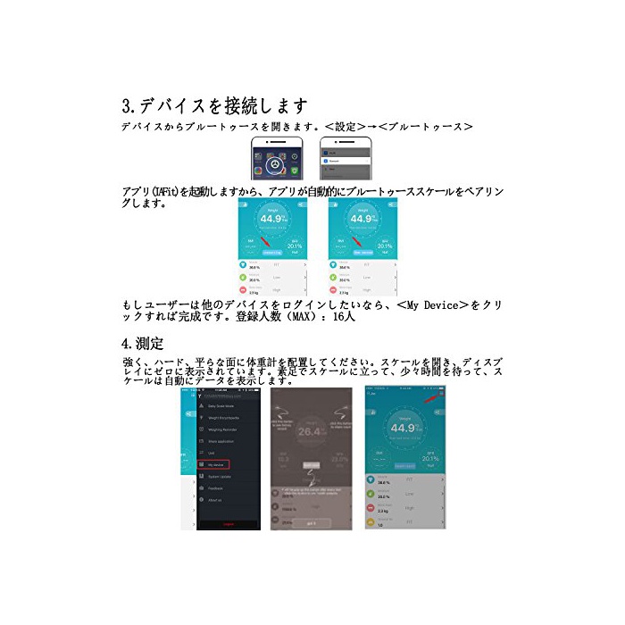 【14의 측정 내용】자동적으로14의 다른 유저까지 인식 합니다.체중이나 BMI,기초 대사(Kcal)고, 근육량Muscle(%)고, 체지방 율Fat(%)고, 추정골 양Bone(Kg)고, 체내 수분율TBW(%)등이 측정 가능합니다.최대8명인 유저 프로파일을 작성하는 것 를 할 수 있습니다.건강관리에 도움이 되는 여러가지 서비스를 제공합니다.