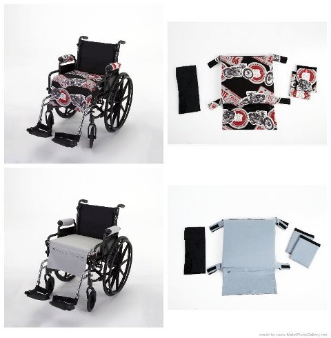 Studio : Wheelchair Solutions Publisher : Wheelchair Solutions Binding : Health and Beauty Product Description Colorful Route 66 Motorcycle design with black with a reversible seat of a solid Grey color; reversible 8" arm rest covers with integrated zippered personal item/security pouch, Black Nylon backpack accessory. Zippers are ultra strength. Includes a comfortable, high-density 3" foam seat cushion which is water resistant. 0