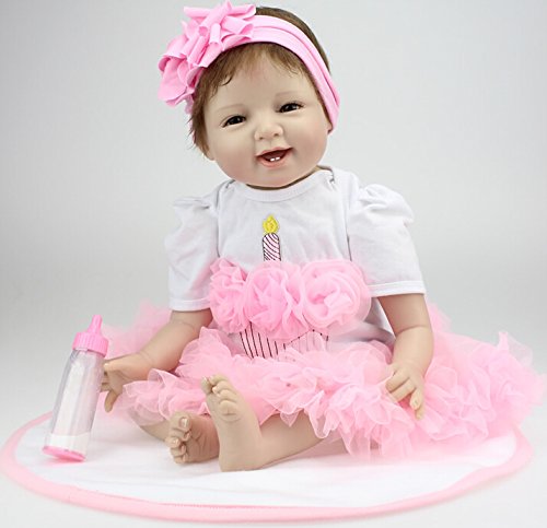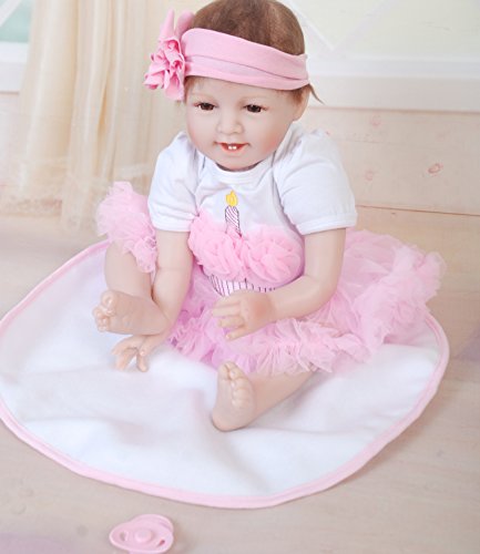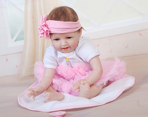 Very soft silicone vinyl with stuffed PP cotton body This baby is 100% handmade. Craftwork with hand printing Dimensions: 55 cm/22 inch. real baby size, deviation exists due to different measuring way Weight: About 1.2 kg Type :Silicone vinyl doll Material: High quality Silicone vinyl, soft and hard vinyl.Head,hands and feet part are silicone materials. The body is cotton body, very soft, very comfortable. Doll's limbs can be movable and can sit and lie down but can't stand up,can't speak. Note:this doll can not be put into water. Eyes: high-grade acrylic eyes. Hair: mohair, handmade one an implantable, high fidelity, washable, can be combed . Clothes: Just as picture shownFeature
