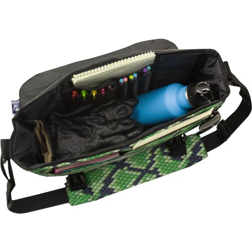 54215 Features: -Pattern: Snake Skin. -2 Exterior front pockets. -2 Utility pockets for phones, pens or paperbacks. -2 Buckle straps plus VELCRO® Brand closure for added security. -Adjustable padded shoulder strap. -Great for school or afternoons at the coffee shop. Product Type: -Messenger bag. Pattern: -Animals/Insects. Color: -Green. Primary Material: -Nylon/Polyester. Construction: -Soft-sided. Exterior Pockets Included: -Yes. Shoulder Strap: -Yes. Gender: -Male. Dimensions: Overall Height - Top to Bottom: -10". Overall Width - Side to Side: -15". Overall Depth - Front to Back: -5". Overall Product Weight: -1 lbs.