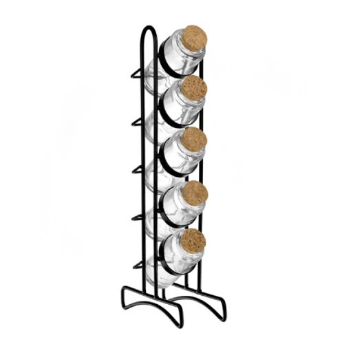 MODERN DESIGN HERB, TEA & SPICE STORAGE RACK W/ 5 GLASS SPICE JARS ~ G159 CONTEMPORARY BLACK METAL SPICE RACK WITH 5 CORK TOP 3.4 OZ. GLASS BOTTLES