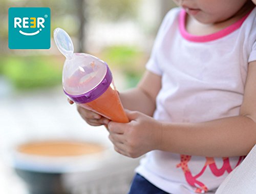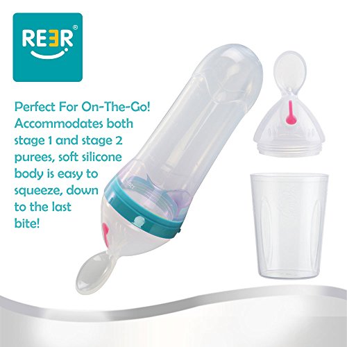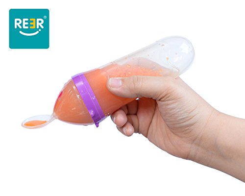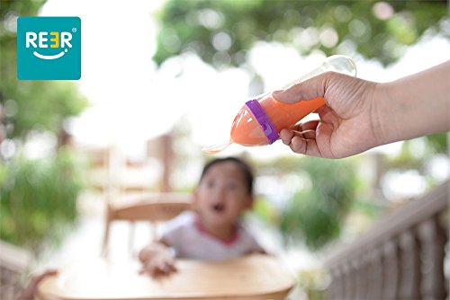 ReeR® Heat Sensitive Travel Infant Silicone Squeeze Feeder Baby Food Feeder with Two Flows Dispensing Spoon and Lid, 4 Ounce/120ml fit for babies of 6m ! The Squeeze Feeder is designed for the feeding of cereal and semisolid food. The Squeeze Feeder holds 4oz. / 120ml of cereal and semisolid food.