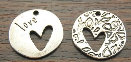 LOVE HEART PENDANT NECKLACE - Double-sided round pendant with heart cutout. 21x22mm. Antique silver color zinc alloy. Love stamped on the front, pattern texture on the back. SNAKE CHAIN: 18 inches with two inch extender.