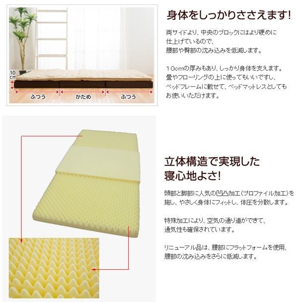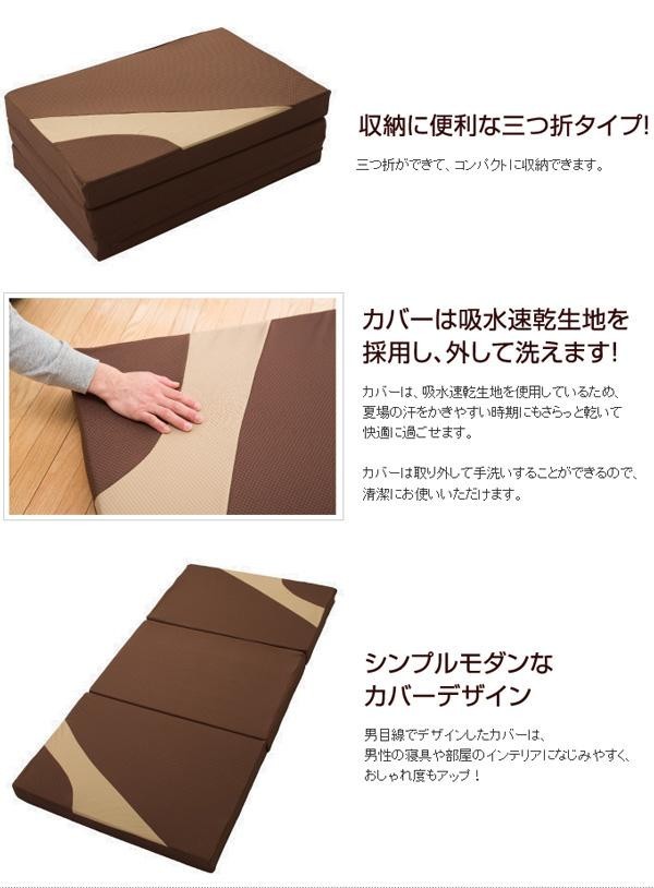 | 男性向けに硬めのウレタンフォームを採用。また身体の荷重バランスを計算し、快適な寝姿勢を維持できるようにしました。これによって寝姿勢を保つだけではなく、通気性も確保しました。またカバーは、吸水速乾加工を施してあるため、夏場の汗をかきやすい時期にもさらっと乾いて快適に過ごせます。更に取り外して洗うことができるため、清潔に保つことができます。 |