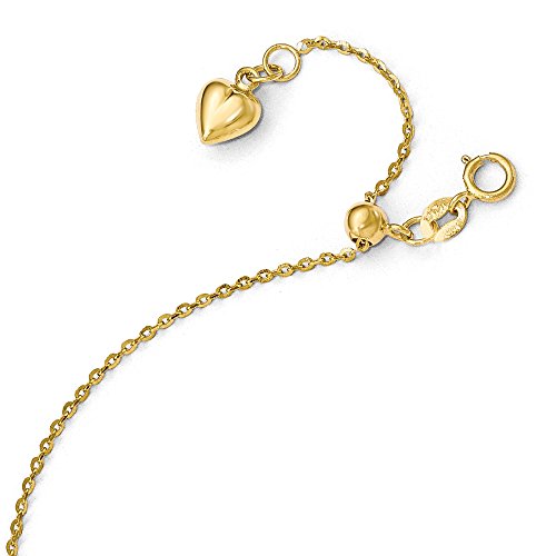 Simple, classic and ready to adorn your ankle, this delicate 14k yellow gold cable chain anklet is 1mm in width and features a dangling 6mm puffed heart and slide mechanism with a spring ring clasp that adjusts to any length up to 11 inches. Made in ItalyFeature