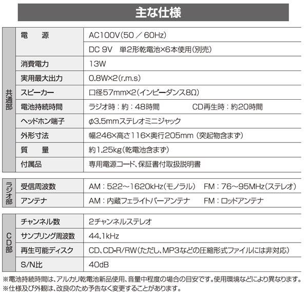 AM/FM(FMステレオ放送受信)対応。CD、CD-R/RWディスクの再生にも対応しており、プログラム・リピート機能付きです。