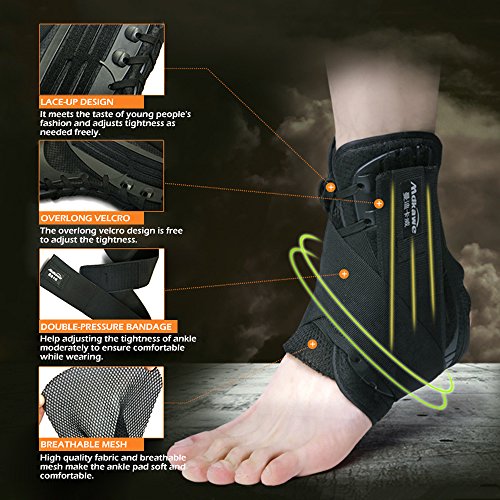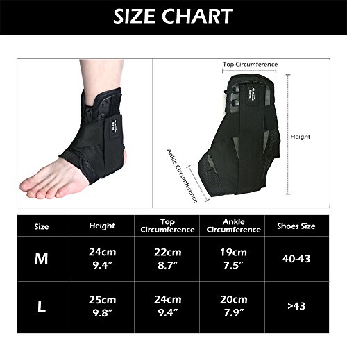 -. Feature : SUPPORT: Side stabilizers help to reinforce your ankle while maintaining complete flexibility to offer you total support and protection against injury during running, hiking, tennis, golf, soccer, volleyball, cycling, basketball, softball, baseball, weightlifting and many other athletic activities. / PAIN RELIEF: Reinforced side stabilizers and contoured arch design quickly reduces pain and pressure on the ankle due to various injuries including arthritis, sprains, swelling, muscle fatigue, and many other chronic or acute types of pain. / ADJUSTABLE: Double strap support and laces increased ankle stability and prevention of further injury. / MESH FABRIC DESIGN: It more breathable which helpful for abstraction of heat and sweat releasing, decreases skin irritation and helps to reduce odor. / NOTE: This ankle brace have left foot and right food, please order the order it as you need and kindly check the size chart below carefully before ordering,choose the best size for you.