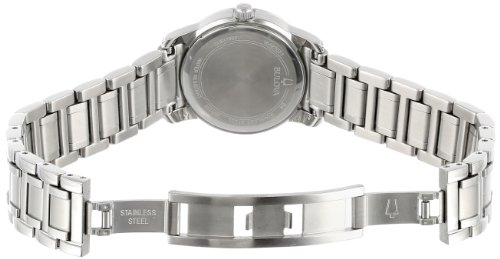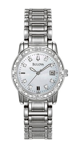 The sparkling, luxurious Bulova Women's Diamond Accented Calendar Watch #96R105 showcases 24 hand-set diamonds on its stainless steel case. A white mother-of-pearl dial with luminous hands and markers, a convenient calendar window at three o'clock, a second hand, and a fashionable, stainless steel bracelet band with a deployment buckle contribute to this timepiece's unique look. Also offering a durable mineral crystal, reliable Japanese quartz movement, and water resistance to 99 feet.Feature