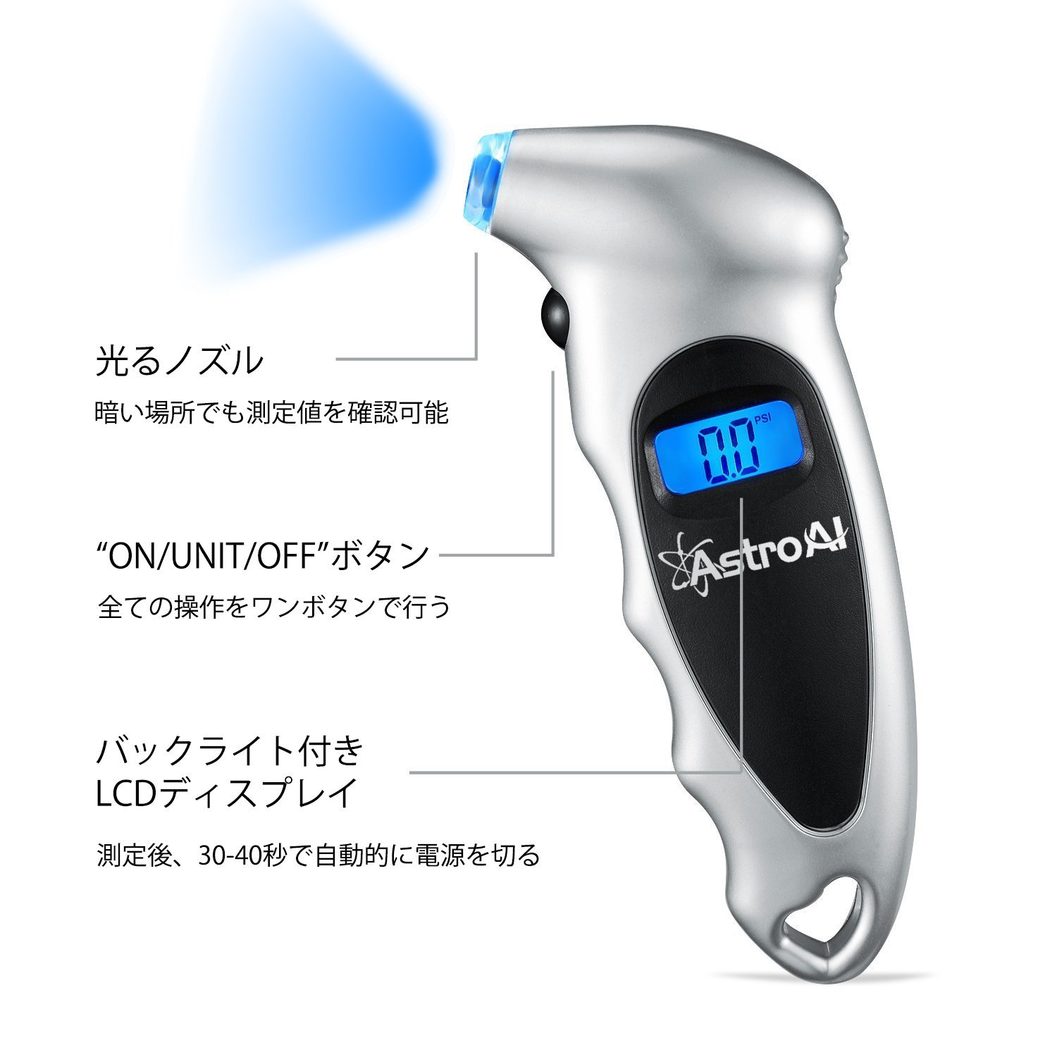 With LCD display with backlight and nozzle with LED, measurement value can be easily checked even in dark places.