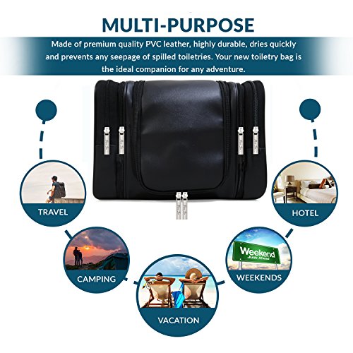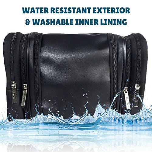 - ★ HIGH QUALITY & WATER RESISTANT: Every toiletry travel bag is crafted with high-quality, water-resistant black PVC leather that looks trendy and professional. The easily washable inner and outer lining allows you to always keep your toiletry bag in pristine condition from those bound to happen spills.