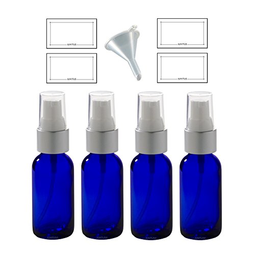 Cobalt Blue Glass Boston Round Silver and White Treatment Pump Bottle - 1 oz (4 Pack) + Funnel and Labels