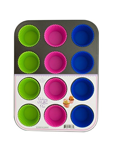 Perfect for baking muffins and cupcakes without the mess, this 12-cup Muffin Baking Pan with Silicone Cups features a durable metal pan with removable colorful silicone cups that allow muffins to easily slide out. Cups are heat resistant and reusable. Measures approximately 13.75'' x 1.25'' x 10.5''. Comes shrink wrapped.
