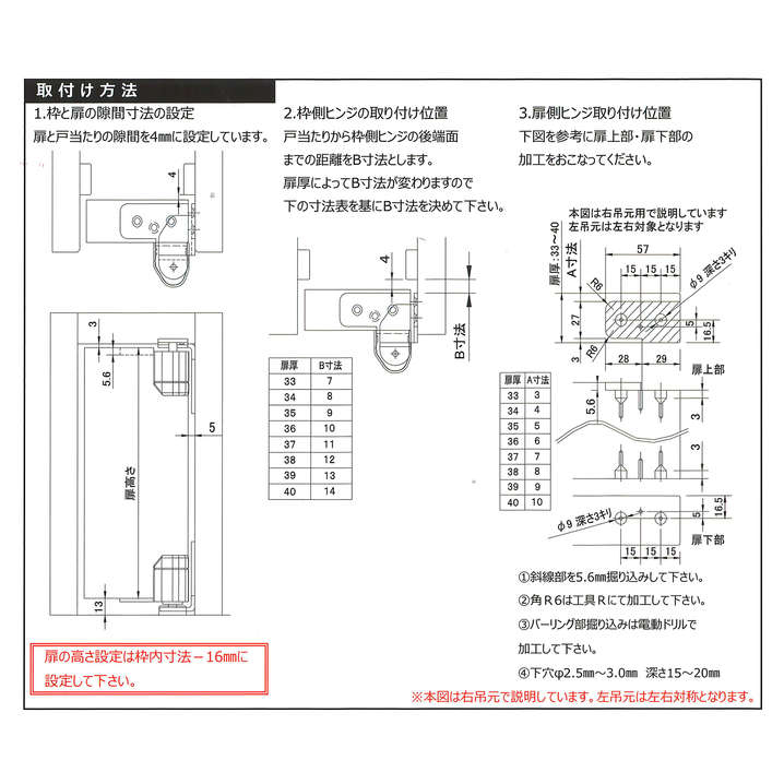●重量:40kg以下 適用扉厚:33㎜~40㎜ 適用扉寸法:幅850㎜以下 高さ2400㎜以下(ハイドア対応可) 調整範囲 上下±2.5㎜ 左右(戸先側)3.0㎜ (吊元側)1.0㎜ 前後 (前側)2.5㎜ (戸当たり側)1.5㎜