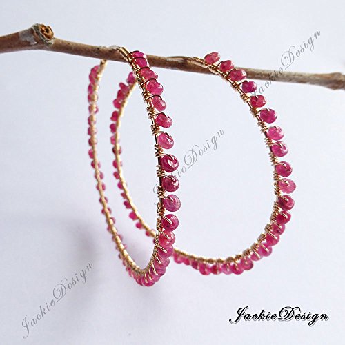 -. Title : 2 inch Large Ruby (dyed) Gemstone Wire Wrapped Hoop Earrings Gold Filled