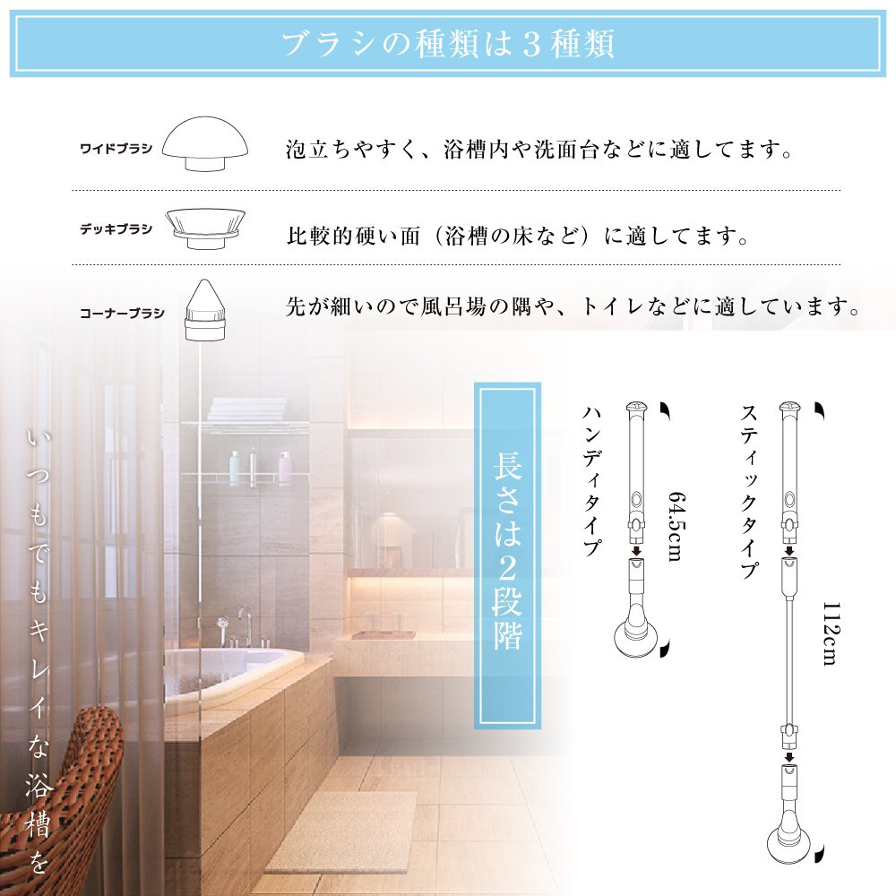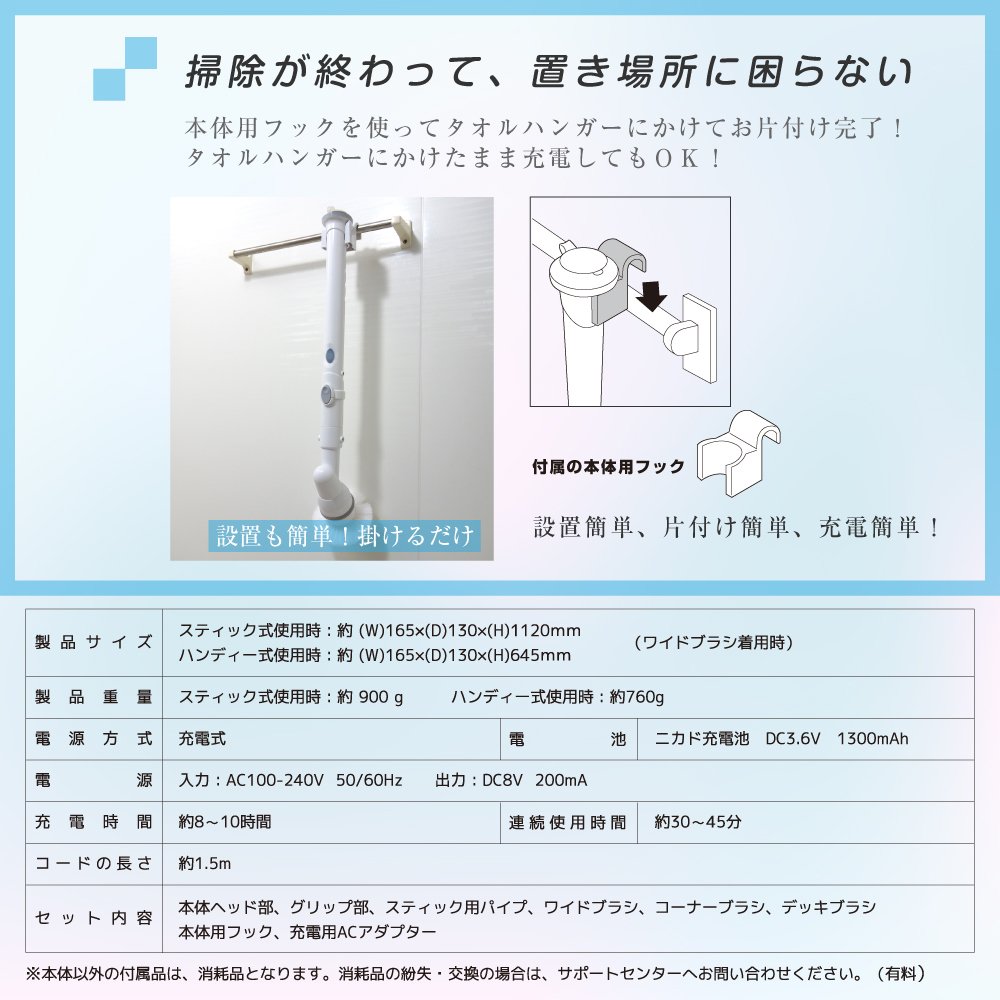 Includes: body head part, grip part, pipe for stick, wide brush, corner brush, deck brush, body hook, charging AC adapter