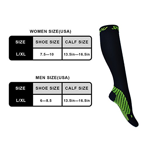 ★ SPORTS COMPRESSION SOCKS - Compression sports socks to adapt to shoes sizes are 14.96-16.54". Crus surrounds degrees are 13.38- 16.54". Compression Socks are very durable design, but without compromising quality or Comfort. Compression running socks for women the material of Spandex28%/Polyamide72%.Really comfortable and your legs never hurt.