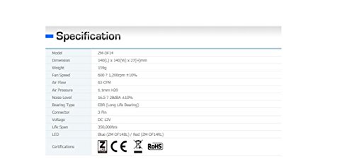 Air Pressure: 1.1mm H20 / Noise Level: 16.5 - 28dBA 10% / Bearing: EBR (Long Life Bearing) / Voltage: DC 12V / Life Span: 350,000 hrs.