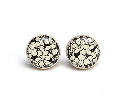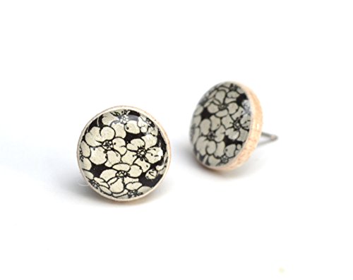 -. Title : Black and white floral stud earrings. Wood studs by Starlight Woods