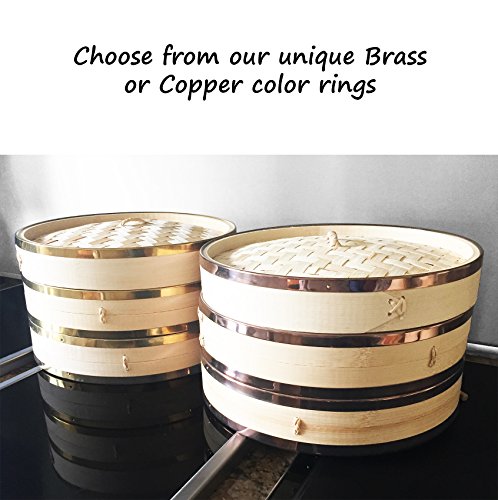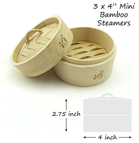 Our 10 inch bamboo steamers are made from the highest quality woven bamboo. They are sturdy and waterproof and with brass color stainless steel banding, trap moisture better as well as look incredibly stylish! The two-tiered design allows you to cook rice, cous cous, vegetables, fish, shellfish and meat at the same time. And the three 4 inch mini steamers offer further versatility so you can cook dim sum, dumplings, wontons and other Chinese starters to complete the perfect Asian menu.