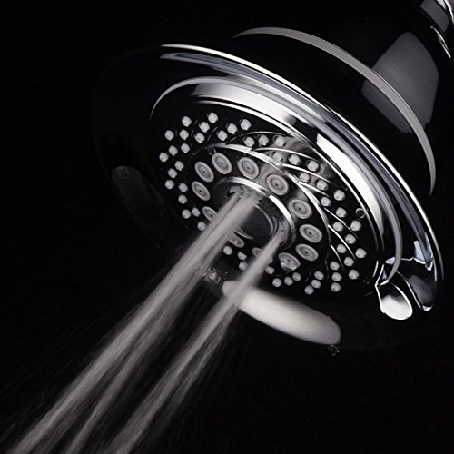 SHOWER HEAD: 6 Full Setting Shower Head • Extra-Large 5" Chrome Face • 3-zone Click Lever Dial • Rub-clean Jets • Angle-adjustable • SpiralFlo Design
