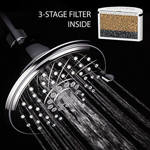 SHOWER HEAD WITH SHOWER FILTER SYSTEM: The latest in showerhead style and performance PLUS purified shower water! This luxurious shower system is the best in shower head design with the latest in shower water filtration technology. High-Power 6-setting Showerhead with 3 Stage KDF/Active Carbon Shower Filter delivers an amazing shower HotelSpa® experience while removing harmful chlorine and other toxins from your shower water