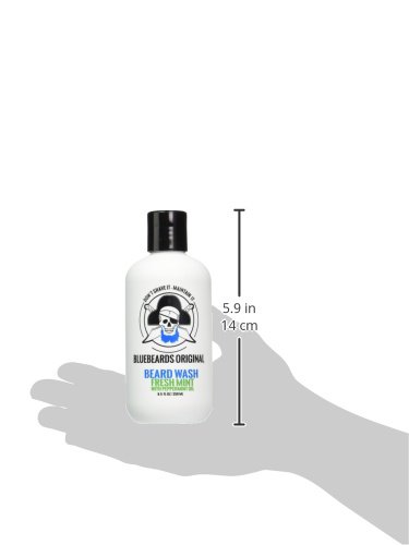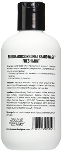 -. Binding : Misc. -. Brand : Bluebeards Original -. EAN : 0885573093549 -. Feature : 8 oz / Peppermint and menthol are the real deal -- not artificial fragrances / Paraben free / Wheat amino acids condition the beard / Directions: Wet face and neck. Place a small amount of Beard Wash on tops of fingers and massage into beard and face using a circular motion. Rinse beard throughly. Can use daily. -. IsAdultProduct : 0 -. Label : Bluebeards Original -. Manufacturer : Bluebeards Original -. Model : NA -. MPN : BLUEBEARD_MINTWASH -. PackageQuantity : 1 -. PartNumber : BLUEBEARD_MINTWASH -. ProductGroup : Health and Beauty -. ProductTypeName : HEALTH_PERSONAL_CARE -. Publisher : Bluebeards Original -. Size : 8.5 Ounces -. Studio : Bluebeards Original -. Title : Bluebeards Original Fresh Mint Beard Wash with Peppermint Oil, 8.5 Fl Oz -. UPC : 787734695527