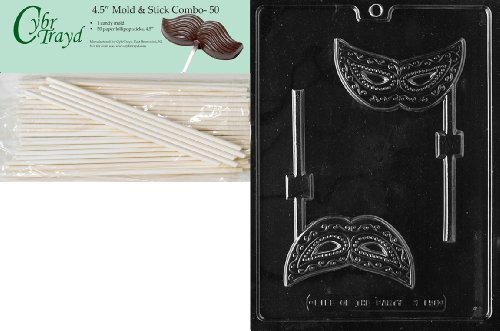 Cybrtrayd 45St50-M158 Mask Lolly Miscellaneous Chocolate Candy Mold with 50-Pack 4.5-Inch Lollipop Sticks