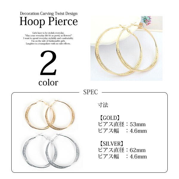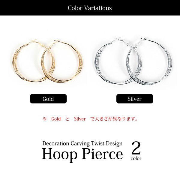 ■商品詳細■(Gold)ピアス直径:約53mmピアス幅:約4.6mm(Silver)ピアス直径:約62mmピアス幅:約4.6mm