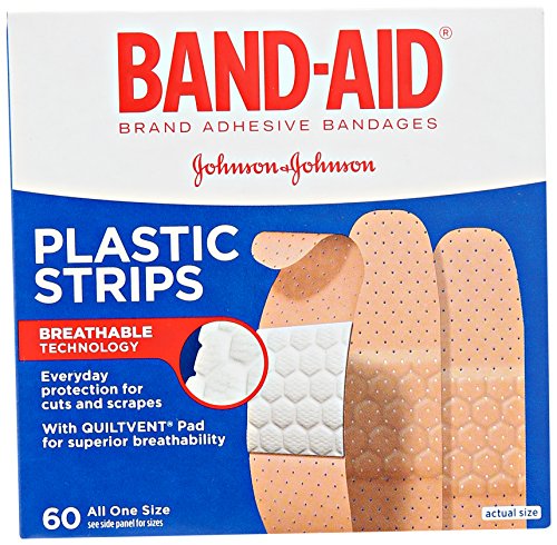 -. Binding : Health and Beauty -. Brand : Band-Aid -. EAN : 0381370056355 -. Feature : Long lasting protection for everyday cuts and scrapes / Gentle removal: absorbent pad won't stick to wound / Long lasting unique adhesive helps bandage stay on / 3/4 in x 3 in / Heals the hurt faster -. Label : Johnson & Johnson SLC -. Manufacturer : Johnson & Johnson SLC -. PackageQuantity : 1 -. ProductGroup : Pantry -. ProductTypeName : HEALTH_PERSONAL_CARE -. Publisher : Johnson & Johnson SLC -. Studio : Johnson & Johnson SLC -. Title : Band-Aid Brand Adhesive Bandages, Plastic Strips, Assorted, 60 Count -. UPC : 381370056355