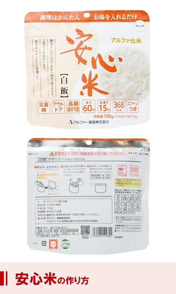 お湯はもちろん水でもできる簡単調理で、非常食・アウトドア・海外旅行に最適な安心米。コンパクト設計で持ち運びしやすく、袋の中にスプーンが入っているので皿に移す必要もなく、袋のまま召し上がれます。長期保存可能なので、いざという時のためのストックとしてオススメです♪ |