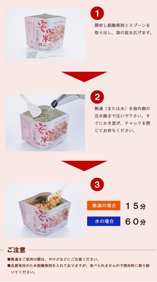 | 熱湯・水を入れて待つだけで、ご飯ができあがります♪ |