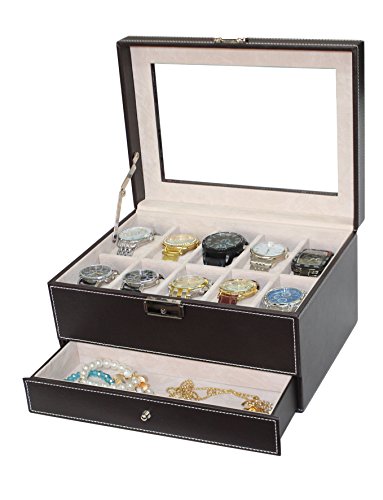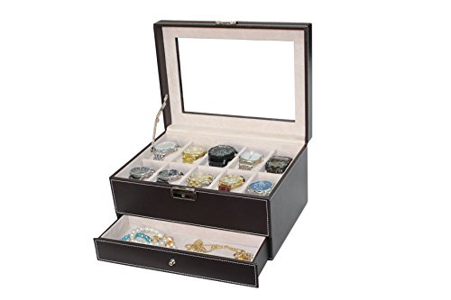 -. Title : Sodynee Watch Box Large 10 Mens Brown Pu Leather Display Glass Top with Jewelry Box Case Organizer Tray