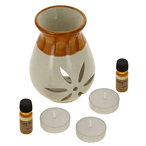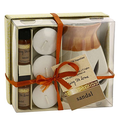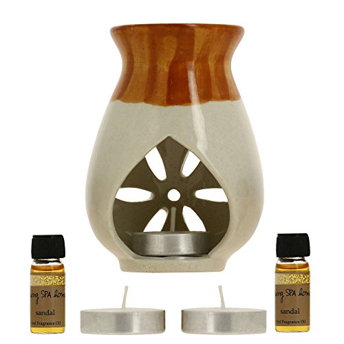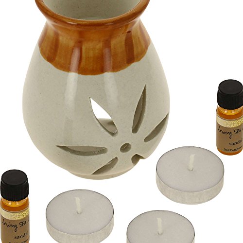 Indian Sandalwood Fragrance Gift Set with Pair of 10mL Fragrance Oils, 3 Tealight Candles and a Handcrafted Ceramic Burner Vaporizer – Use for Air Freshener, Aromatherapy or Ayurveda