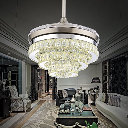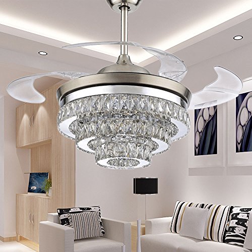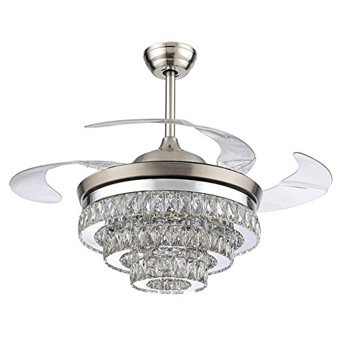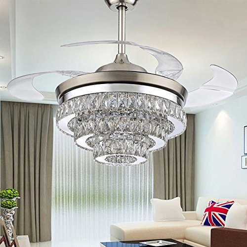 Crystal Ceiling Fan Light with 4 Acrylic Transparent Retractable Blades Automatic Freely to Pull Back, Saving Space for Living Room, It is Really a Good Dectorator for Home