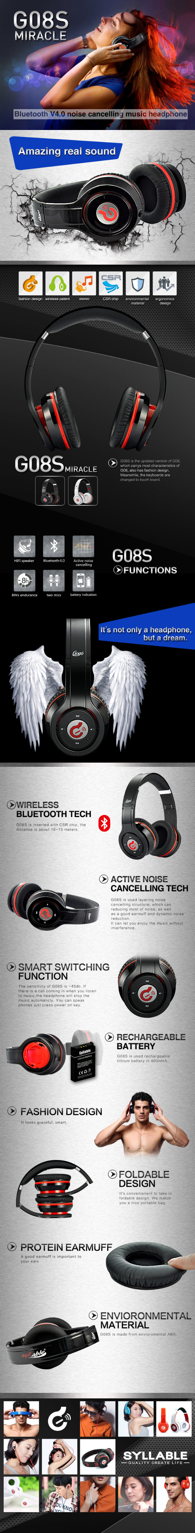 Syllable G08S Bluetooth V4.0 Earphone Noise Cancellation High-definition Stereo Headphone Headset for iPhone/Samsung