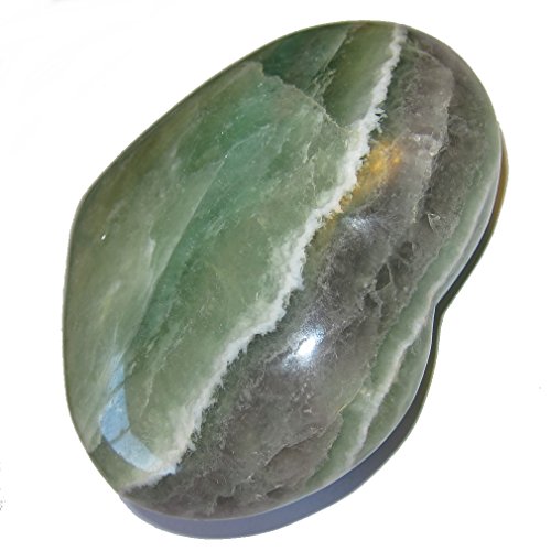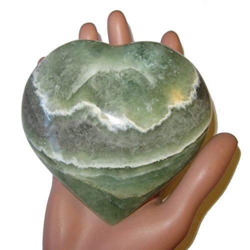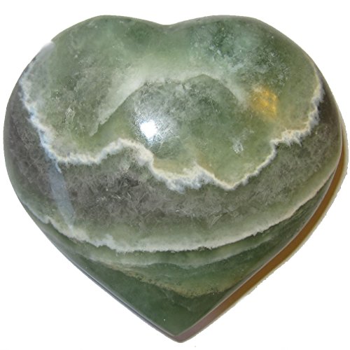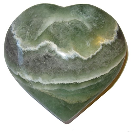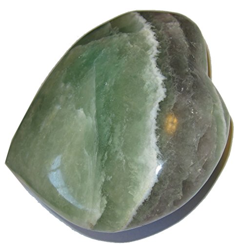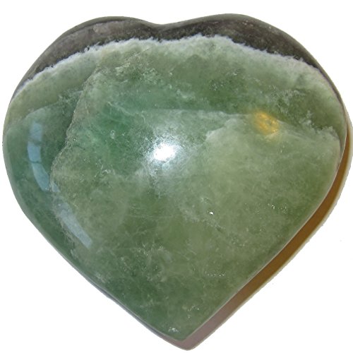 - Your jumbo heart is made from wonderful green fluorite crystal. This carving has nice semi-clear qualities with a purple sash and white lace patterns. It is polished to a shine, yet retains lots of natural lines, cavern nooks and ridges. Receive this one of a kind beauty when you order from Satin Crystals.