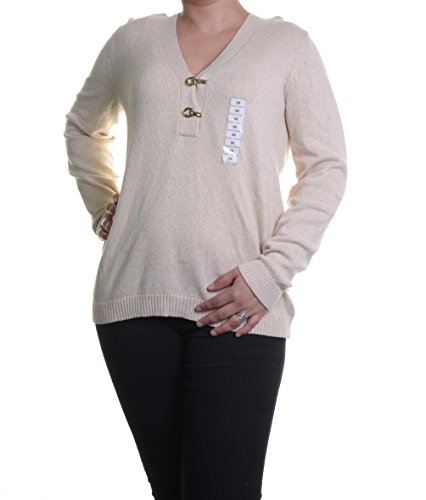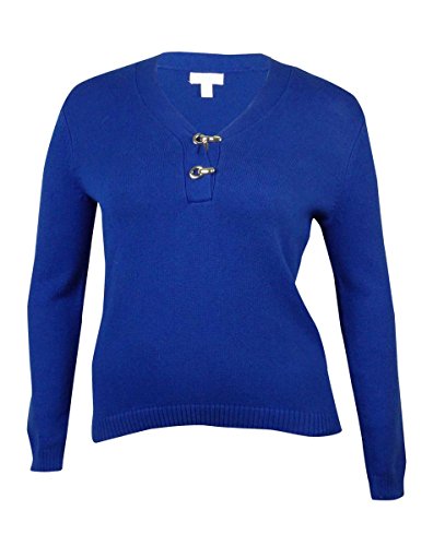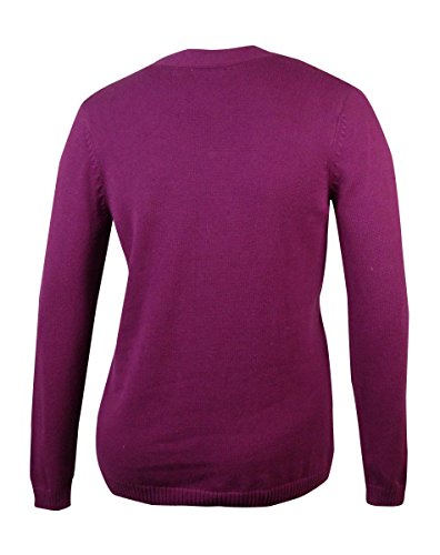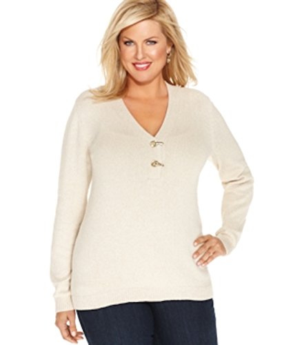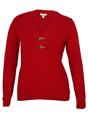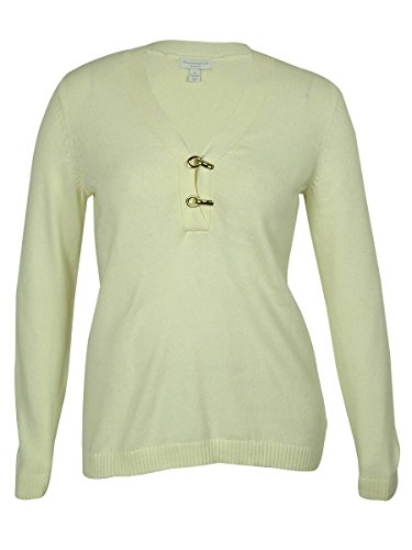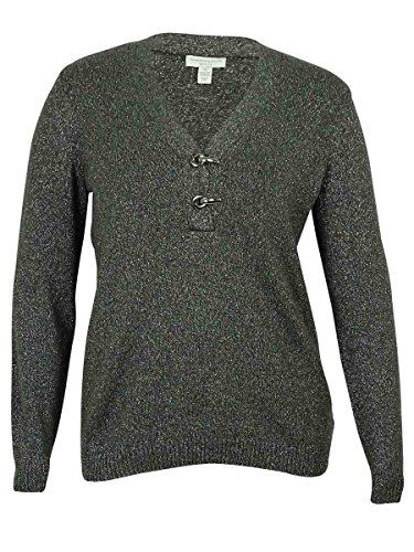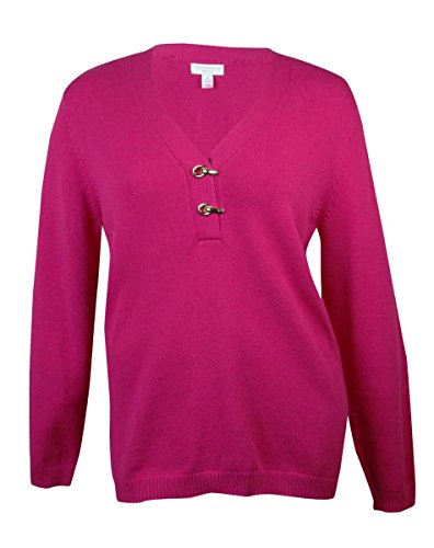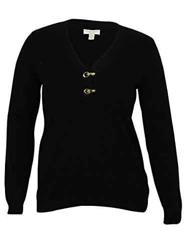 Sweater features knit cotton blend fabric, V-neck with clasp detail, long sleeves and pullover style.