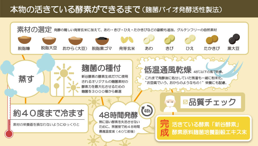 夜遅いごはんでもシリーズは、本物の活きている酵素「新谷酵素」を使用しています。なかでも、「夜遅いごはんでも極」の酵素は、【麹菌バイオ発酵高活性法】によって作られた【麹菌培養副穀エキス末】。自然の素材をまるごと使った、活きている酵素です。