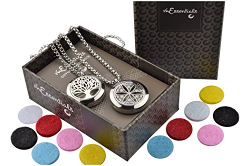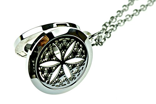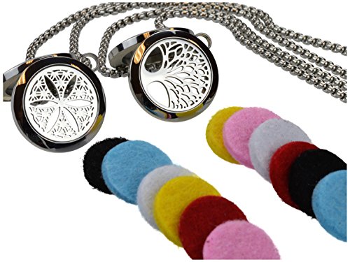 Tree Of Life and Flower of Life Essential Oil Diffuser Necklace Stainless Steel Locket Pendant with 24" Chain + 12 Refill Pads