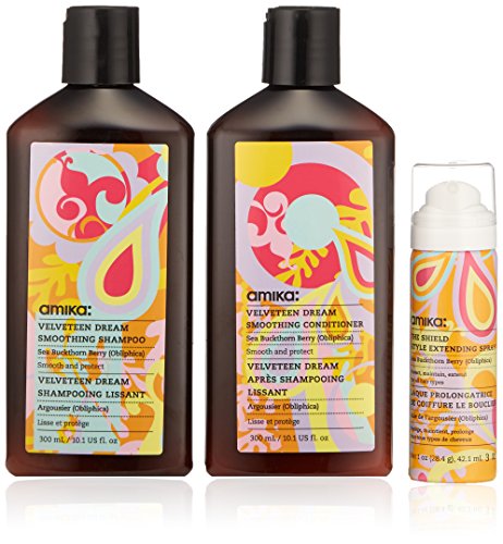 The amika Velveteen Dream Shampoo and Conditioner Collection wash + condition to win the frizz fight. Smoothing and protecting hair so humidity can’t undo what you’ve done to your ‘do. Time-release formula provides the ultimate defense for silky smooth locks that last. The amika Shield Style Extending Spray is powered by an advanced encapsulating technology, that delivers sub-micron spheres into hairs’ cuticle to form an invisible anti-frizz, anti-humidity shield. The Best Defense. A controlled, time-release formula maintains this barrier to defend hair against frizz, dulling and dirtying pollution. As clinical testing confirms that a smooth, frizz-free style will stay intact for over 24 hours. Formulated with antioxidant-rich Sea Buckthorn Berry to nourish hair and defend against color oxidation, while UV filters guard from color-zapping UV rays. The heat-activated spray provides a weightless layer of thermal heat defense up to 450°F.