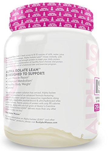 -. Feature : SUPPORT LEAN MUSCLE AND STIMULATE FAT LOSS - No matter how busy you are all day; everybody wants to stay lean, is your protein doing its job? Not only does Alpha Isolate Lean (AIL) contain the finest whey isolate (no bloat) but each serving also supplies an innovative weight loss blend to further stimulate fat loss / BUILD LEAN MUSCLE AND NOT BULK (FLUFF) - If you're looking to build lean muscle, this is the perfect protein for you. Cheap protein blends typically result in a high, unwanted lactose & fat content that results in bloating and stomach aches / MEAL REPLACEMENT/APPETITE SUPRESSANT - Created to be a fully functional supplement that seamlessly meshes and supports the Modern Woman's active lifestyle, AIL can be pled in as a complete meal replacement. Feel fuller, eat less / HIGH PROTEIN, LOW CALORIE - With 20 grams of pure whey protein isolate and only 90 calories, AIL makes for a better weight loss solution than any diet pill could. In conjunction with a strong diet, when consumed daily, AIL will result in weight loss / STIMULANT FREE WEIGHT LOSS - One of the biggest distinguishing factors of AIL is the all-natural powerful weight loss blend. Designed to keep your metabolism running efficiently while fueling muscle growth, it's time to earn the ideal female physique / PROVEN QUALITY - Crafted in one the finest FDA complaint, cGMP facilities in the United States, quality is everything with Alpha Woman. From the raw ingredients to the flavor systems, everything must pass rigorous quality control measures before going to market
