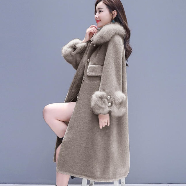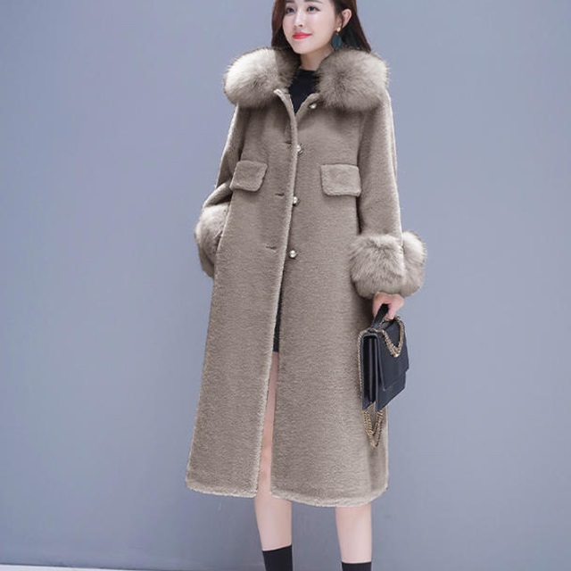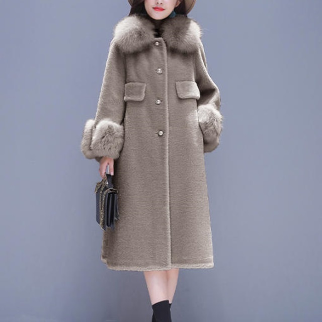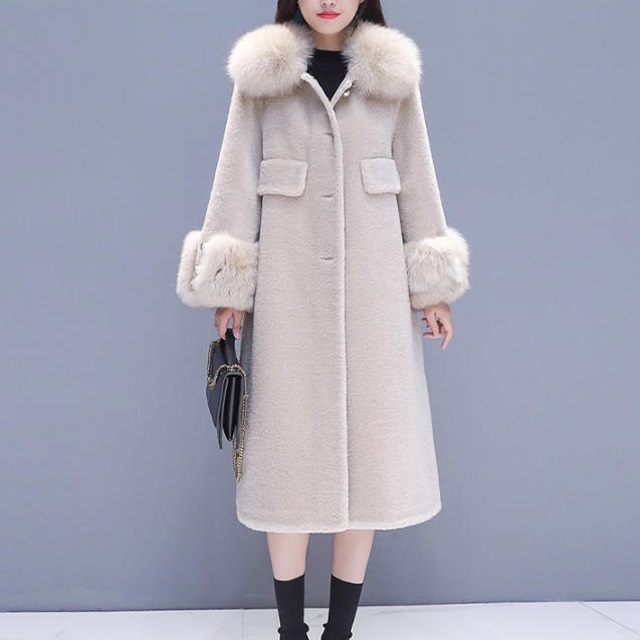 襟元のファーが女性らしさを演出。