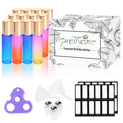 Essential Oil Roller Bottles by PrettyCare ( 12 pack Colorful Glass Bottle 10ml, 24 Pieces Labels, 3 Extra Roller Balls, Opener, 2 Funnels ) Roller Balls for Essential Oils, Roll on Bottles