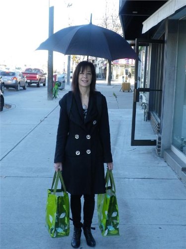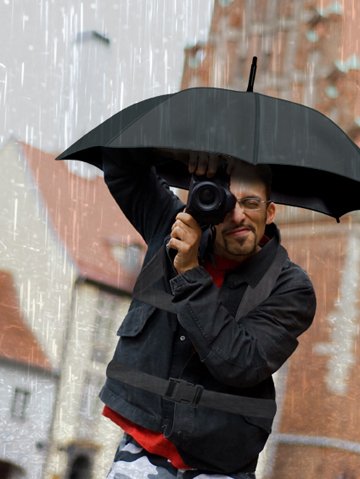 -. Feature : Contains umbrella and sling / Polyester umbrella with wood handle / Hands free protection from rain