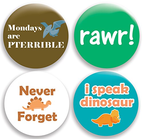 Binding : Apparel Product Description Four LARGE 2.25" (58mm) dinosaur buttons/pins/badges. You will receive FOUR buttons to help spread the awesomeness of dinosaurs. Perfect gift for: parties, workplaces, hospitals, school bags, office functions, winter coats, sweaters, workplace flair, public demonstrations and everything in between. Especially great if you'd like it to be known that you're a proud supporter of dinosaurs! 0