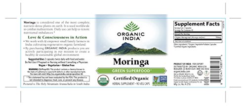 ORGANIC INDIA Moringa CapsulesEnjoy the benefits from one of the most complete, nutrient-dense superfood plants on earth, with ORGANIC INDIA Moringa Capsules. Moringa oleifera capsules are an easy way to get an abundance of inherent vitamins, minerals and amino acids, the building blocks of protein that sustain daily life.