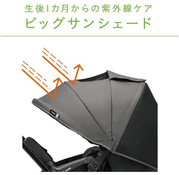 ●生後1か月からの紫外線ケア ビッグサンシェード:幌にUVカット率99%の生地を採用しております。日差しや紫外線から赤ちゃんを守ります。