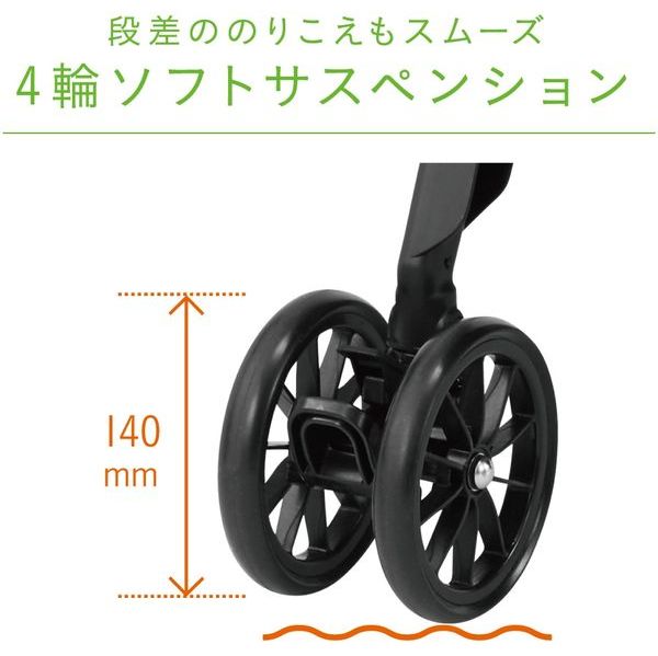 ●段差を乗り越えもスムーズ 4輪ソフトサスペンション:クッション式サスペンションが路面からの振動伝達を軽減。140mm大型ダブルホイールで段差も楽々越えられます。