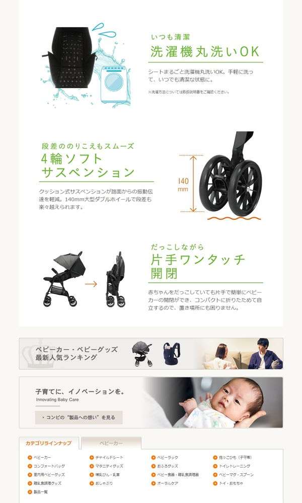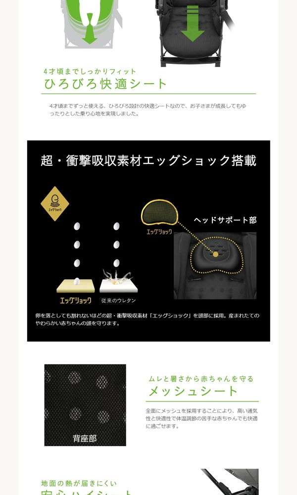●ヘッドサポートに超・衝撃吸収素材「エッグショック」を搭載し、産まれたての赤ちゃんの頭をしっかり守るだけでなく、体温調節の苦手な赤ちゃんを蒸れや暑さから守る「全面メッシュシート」、日差しや紫外線から赤ちゃんを守る「ビッグサンシェード」など赤ちゃんにもママにも嬉しい機能満載です。